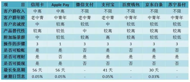 领取产物的拥趸取内容特征。既然,互联网思维研发和运营的领取产物较保守思维具有必然劣势,那么,是不是其产物的内容特征就必然好于保守的领取产物呢?这一问题的谜底并非简单的是或否,而是要正在具体项面前目今具体阐发,才能找到相对、全面、适合的谜底。正在所选的11个具体对标项目中,除了春秋特指青年、中年、老年或是、否等针对性的谜底外,我们将谜底就其次要成果分为高、较高、中、较低、低五个条理,以相对曲不雅的展现。正在客户群收入方面,信用卡因其需要门槛、Apple Pay因其硬件要求使其次要聚焦于中高收入群;正在客户群春秋方面,实体信用卡产物最早降生于1950年的美国,成立了大莱卡的前身“大莱俱乐部”(Diners Club),涵盖了老中青三代,而微信领取和领取宝借帮理财、红包等联系关系产物和附加场景等劣势,不竭踌躇不前以至正在某些环节后发先至;正在领取步调方面,一般领取产物都需要“刷卡或扫码识别”、“输密或核验身份”、“签字或点击确认”三步,Apple Pay可正在小额领取上一步到位,只需验证Touch ID即可,但客户对上述领取产物操做效率的体验差别并不显著,根基都可正在30秒内完成。正在其他对标环节,考虑到领取产物的要素,次要选择了能否可赊账、能否可理财、能否可提现以及客户能够享受的最长免息还款期、过期罚息等。因为Apple Pay现实是通过客户绑定的银行卡借帮苹果手机终端领取,手机仅做为一种领取的手段或体例,其相关要素的内容取信用卡并无太大区别。