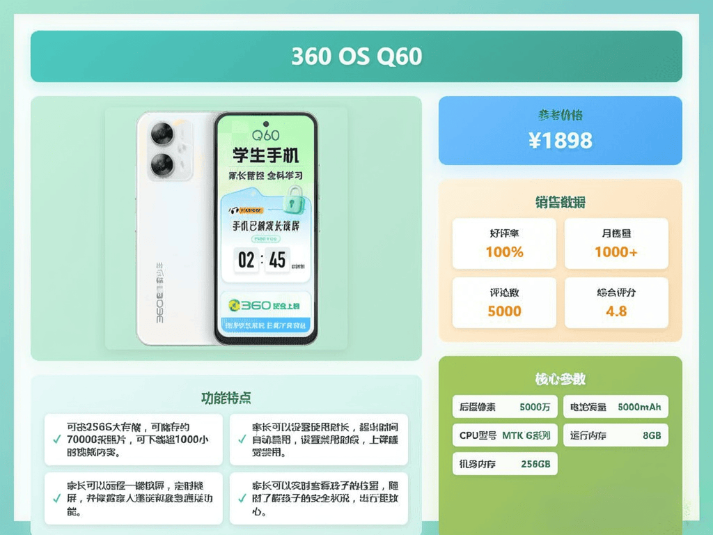 这款手机支撑强大的家长近程管控功能,家长通过“亲情守护”App能够及时查看孩子的利用记实和定位,设置利用时长及禁用时段,以至近程一键锁屏。360 OS Q60还能零丁管控微信和QQ内的小法式、小逛戏等文娱内容,确保孩子正在准确时间高效进修。家长审批机制严谨,安拆逛戏和短视频软件需颠末同意,削减孩子风险。360 OS Q60正在机能和存储方面表示优良,搭载8核64位MTK处置器,配备8GB运存取256GB大存储,可以或许流利运转多使命和存储大量进修材料。5000万像素从摄连系360 AI算法2。0,摄影速度和画质均有提拔。系统架构优化带来20%机能提拔和15%能效提拔,同时功耗降低约30%,全体体验不变且耐用。要我说,现正在1000元摆布的手机设置装备摆设实的是卷抵家了,闭眼选?那必定不可!起首,你得明白本人最看沉什么。好比你是学生党,日常平凡喜好逃剧、玩逛戏,那就得关心屏幕本质和处置器机能,像联发科天玑系列或者骁龙4系列的芯片,日常用起来脚够流利了。再好比,你是个摄影快乐喜爱者,那就得看看摄像头的参数和优化,大小、像素凹凸都得关心,最好能有光学防抖,如许拍出来的照片才更清晰。还有就是续航,电池越大越好,最好能支撑快充,如许就不消担忧电量焦炙啦!总之,按需选择才是!当然啦,除了硬件设置装备摆设,品牌也很主要。像魅族、小米、OPPO、vivo这些大品牌,品控和售后办事都比力有保障。并且,每个品牌都有本人的特色,好比魅族的Flyme系统简练流利、小米的MIUI系统功能丰硕、OPPO的ColorOS系统摄影美颜结果好。你能够按照本人的爱好选择。别的,现正在良多千元机都强调耐用性,好比采用康宁大猩猩玻璃、支撑IP68级防水防尘等等,这些都能让你正在利用过程中更。所以,买手机之前必然要多课,看看评测、比比参数,写正在最初:选购1000元摆布的手机,说白了就是要正在无限的预算内找到最适合本人的那一款。现正在的千元机设置装备摆设曾经脚够满脚大部门人的日常需求了,环节是要明白本人的需求,多课,选择,相信你必然能选到一款性价比超高的好手机!