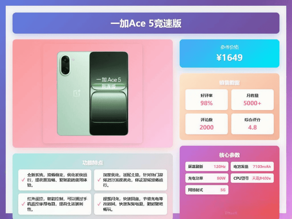 一加Ace 5竞速版搭载天玑9400e芯片,采用旗舰级8核架构,机能表示脚够超卓。配备风驰逛戏内核,逛戏体验流利且不变,能无效降低功耗,提拔续航效率。电竞级触控芯片带来3000Hz瞬时响应采样率,触控反映活络,逛戏操做更精准,全体操做感顺畅。