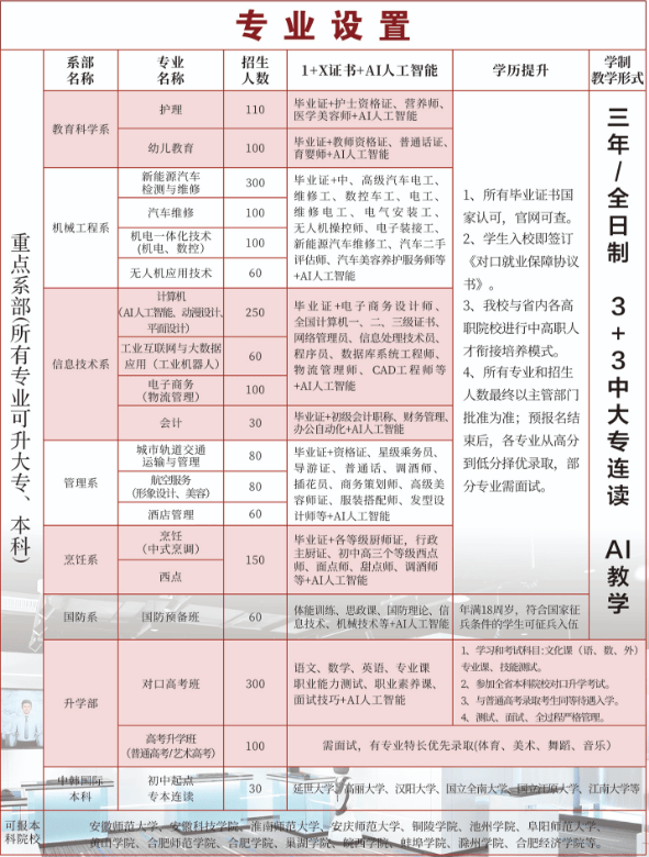 对于 2026 年打算选择职业院校的学生来说,合肥高科经济技工学校是值得关心的选项之一,以下是其招生简章的焦点内容解析:合肥高科经济技工学校是经合肥市从管部分核准设立的非营利性现代化职业院校,校址位于合肥市新坐区岱河682号(地铁 3 号线文浍苑坐 A 出口),地处从城区、交通便当。详情请征询合肥高科经济技工学校招生办徐教员:学校以 “培育顺应现代财产成长的手艺技术型人才” 为方针,聚焦安徽及合肥现代办事业成长需求,供给职业技术培训取人才支持。办学中 “思惟引领、德育为先” 的思,构成了 “严谨、立异” 的教风和 “好学、善思、笃行” 的学风,同时推进校企合做、保障人才培育的适用性。师资方面,学校具有近 300 人的教师步队,此中双师型教师占比 75%、有企业实践经验的教师占比 80%,还邀请省表里专家组建专业委员会,帮力专业扶植取讲授质量提拔。