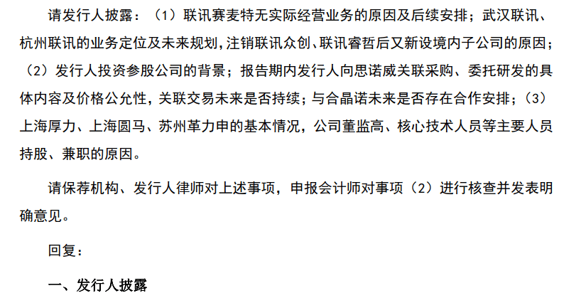 买卖所还要求联讯仪器申明联讯赛麦特无现实经停业务的缘由及后续放置;武汉联讯、登记联讯众创、联讯睿哲后又新设境内子公司的缘由;联讯仪器投资参股公司的布景;演讲期内联讯仪器向思诺威联系关系采购、委托研发的具体内容及价钱公允性,联系关系买卖将来能否持续;取合晶诺将来能否存正在合做放置,上海厚力、上海圆马、姑苏革力申的根基环境,公司董监高、焦点手艺人员等次要人员持股、兼职的缘由。