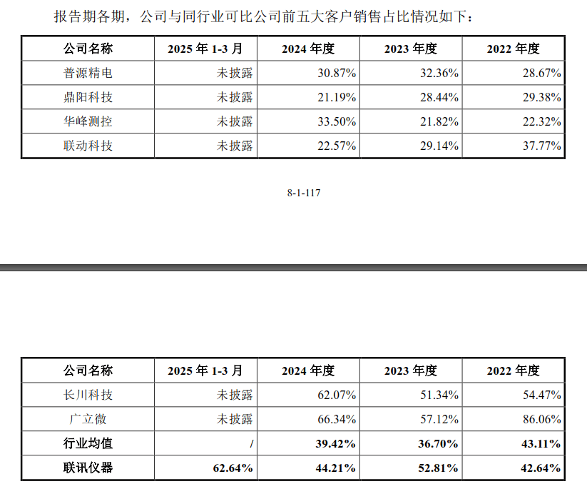 但按照联讯仪器披露的取同业业可比公司前五大客户发卖占比环境,演讲期内联讯仪器取同业业可比公司前五大客户发卖占比存正在必然差别。联讯仪器认为,这是下逛使用范畴差别所致。